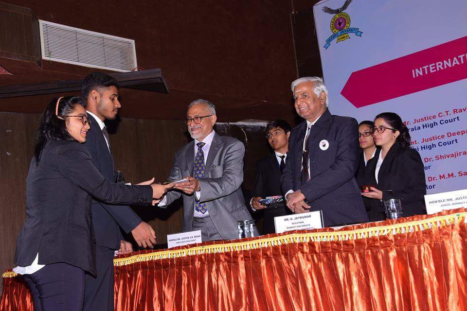 However, our competition was on 23rd and 24th March. The day before the competition the orientation program was held. The speeches we listened to, still echoes in our minds, those valuable words from high profile personalities of the Legal Arena. In the evening we came back to the guest house and organized our exhibits, practiced our speeches repeatedly and took preparation for the battle, the intellectual battle. 33 teams, 98 participants, 50 judges, a tough competition indeed.  On the day of the battle,  three of us headed towards New Law College, Bharati Vidyapeeth Deemed University dressed formally like veteran Lawyers. This made us more confident. On the opening ceremony we saw the life sketch of Justice P.N. Bhagwati, 17th Chief Justice of India, such a magnificent soul, a path finder, a pioneer of ensuring human rights all over the India. After being enlightened with his fascinating contribution in the Indian Judiciary, we came to know about another great personality Patangrao Kadam, A successful, honest politician, who was an educationalist and founder of Bharati Vidyapeeth. With a feeling of contentment, we went to our respected Court Rooms.  The day before this, our opponents were announced. In the first round we were Respondent and the applicant side was National Law College, Pune. That team was simply amazing. Their vast preparation was being reflected in their memorial and Compendium. However, we gave our submissions before two respected judges and faced their questions several times. With a hard competition the first round came to an end. After that, our team escort, a first year student of New Law College, took us to have lunch. The Lunch was unimaginably delicious. The arrangements were in a buffet, so we could eat as much as we want. The zeera rice, daal, chapati, papar, paneer curry, shri khand, pickles, ice cream were really tasty. Piyal bhai was preparing for the second round so hard that he didn’t take the lunch. After having lunch we went for the second round. And at that time, our opponent was a team from Dhaka University, Bangladesh. Rifat and Mashraf bhai were on the respondent side and we were the applicant this time. On this round, we felt that we could give our best. The opponent was strong as well and as we observed they could convince the judges in a better manner. While giving submissions they were engulfed into the characters they were playing and that was the best part of them. After finishing the second round we waited for the results of preliminary round. Meanwhile, we talked to other international students and got acquainted with their lifestyle, education system and what not. The students of new Law College appreciated our Moot enthusiasm that made us travel a long way to another territory. We gathered inside the auditorium for the results. From 33 teams, only 4 teams made it to semifinals. We missed the next round yet learnt a lot. But the happiness was that another team from DU was in the semifinal to represent Bangladesh. Next day we watched the finals between Dhaka University and Symbiosis Law School, Pune. It was a hard competition. At the end, the Symbiosis Law School, the applicant side became the Champion. It was a victory of Human Rights, the judges acknowledged. And it is a must to mention that, Piyal bhai got a Special Mention Award for his noteworthy excellence. It was another moment of pride for us.